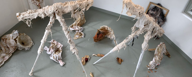 This sculptural installation originates from casts from my body. My performance expression to sculpt on my own body.