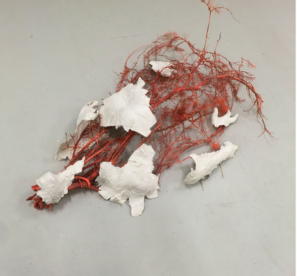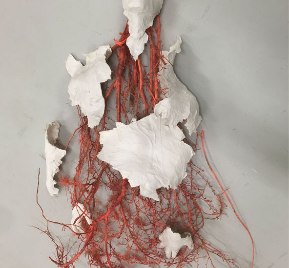 Fragment of a self-portrait, or negative preserving the impression of the body. I stack, balance the fragments, like stratifications with innovative suggestions for forms and expressions. A branchwork painted in red completes the form like a circulatory system for this fragmented body. Transformations from past to present meet.